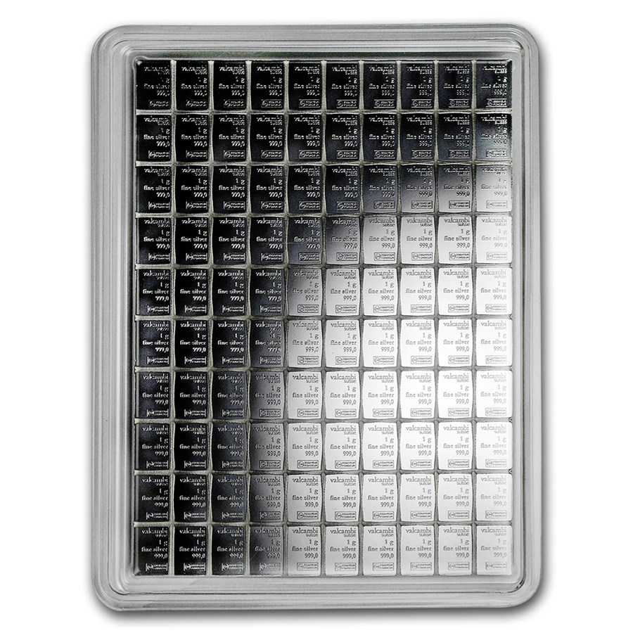The Valcambi Gold CombiBar is a 50-gram sheet of .9999 fine gold pre-scored into 50 individual 1-gram bars. Each gram-bar is stamped with its weight, purity, and the Valcambi logo. The bars can be snapped apart along the perforation lines without losing any metal, giving the holder divisible gold in gram-sized units. The full sheet is about the size of a credit card. This format solves a practical problem: it lets you separate and sell small amounts of gold without cutting or melting a larger bar. Comes sealed in a Valcambi assay package.