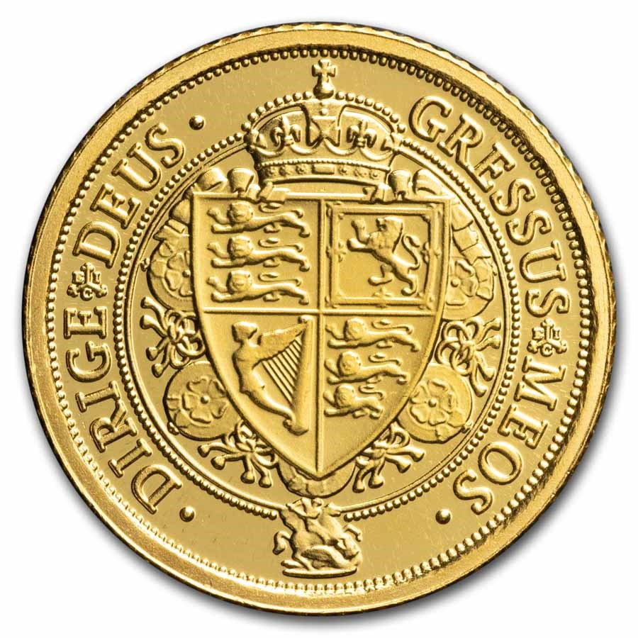 The Gold Spade Guinea, also produced by the East India Company for St. Helena, takes its name from the spade-shaped shield on the reverse, a design first used on guineas struck during King George III's reign in 1787. This modern version contains 1/4 troy ounce of .9999 fine gold, measures 22mm, and is legal tender of St. Helena with a face value of £25. The high purity qualifies it for IRA inclusion.